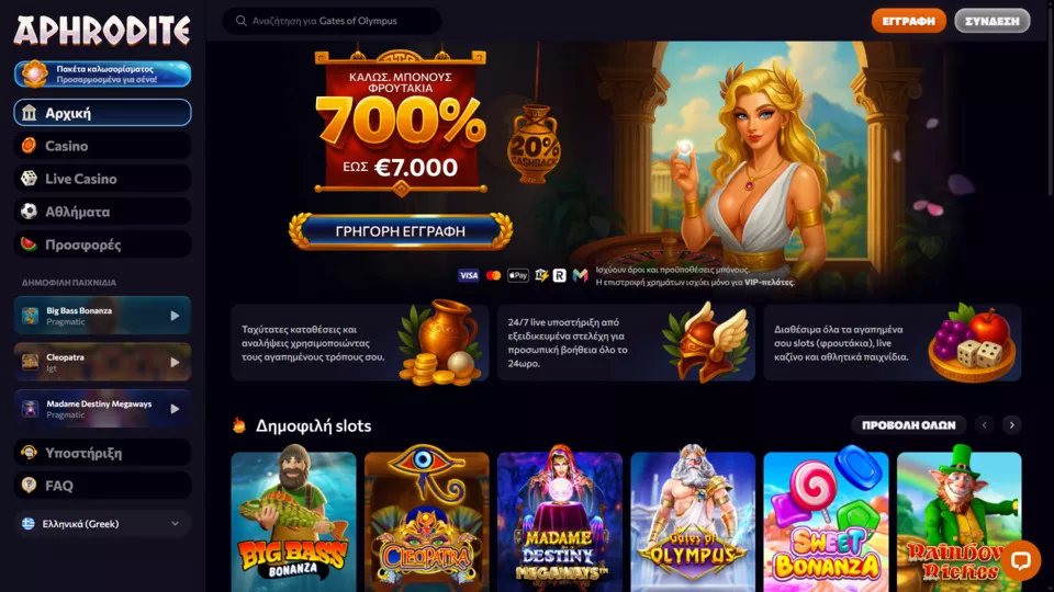 Αφού εγγραφείτε στο διαδικτυακό καζίνο Aphrodite, θα μπορέσετε να επιλέξετε ανάμεσα σε πολλούς τίτλους παιχνιδιών και να κάνετε τις συναλλαγές σας με διάφορους τρόπους. Οι νέοι παίκτες μπορούν να διεκδικήσουν ένα πλούσιο πακέτο καλωσορίσματος, ενώ υπάρχουν πολύ ενδιαφέροντα μπόνους και για τους ήδη ενεργούς παίκτες. Όσον αφορά το παιχνίδι από κινητά, μπορείτε να παίξετε κανονικά μέσω του προγράμματος περιήγησης που χρησιμοποιείτε με την έκδοση του καζίνο για κινητές συσκευές iOS και Android.