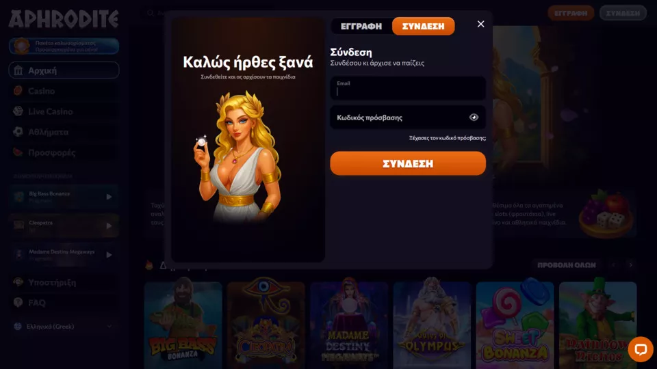 Για να μπορέσετε να συνδεθείτε στην πλατφόρμα του καζίνο Aphrodite, θα πρέπει να ανοίξετε τον επίσημο ιστότοπό του και να πατήσετε στο «Σύνδεση» που θα βρείτε στο επάνω δεξιά μέρος της ιστοσελίδα. Έπειτα θα σας ζητηθεί να εισάγετε το email σας και τον κωδικό πρόσβασης που έχετε ορίσει και να πατήσετε «Σύνδεση