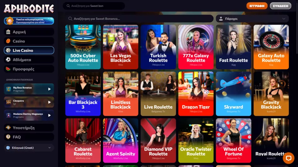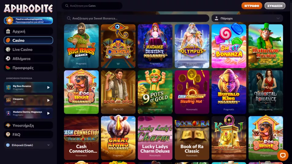 Το καζίνο Aphrodite έχει παραπάνω από 3.000 παιχνίδια από 40+ δημοφιλείς παρόχους λογισμικού. Μπορείτε να επιλέξετε ανάμεσα σε φρουτάκια, ζωντανά παιχνίδιακαζίνο, επιτραπέζια παιχνίδια, παιχνίδια Crash και πολλά άλλα.
