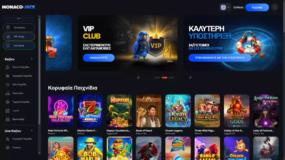 Στο καζίνο MonacoJack θα βρείτε 900+ παιχνίδια από 15 παρόχους λογισμικού. Μπορείτε να επιλέξετε ανάμεσα σε φρουτάκια με τζακπότ και χωρίς, επιτραπέζια παιχνίδια, Bonus buy, τυχερά παιχνίδια, ζωντανά παιχνίδια και πολλά άλλα.