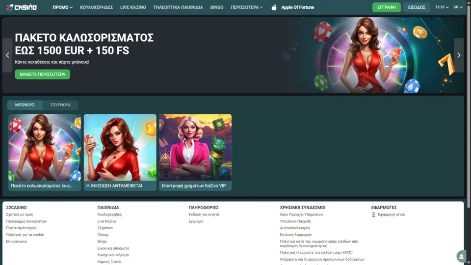 Όταν κάνετε την εγγραφή σας στο καζίνο, θα έχετε την ευκαιρία να διεκδικήσετε ένα πακέτο καλωσορίσματος έως 1.500 ευρώ και 150 δωρεάν περιστροφές. Φυσικά, τα μπόνους στο καζίνο 22Сasino το 2025 περιλαμβάνουν και μπόνους για τους παίκτες που είναι ήδη ενεργοί στην πλατφόρμα.