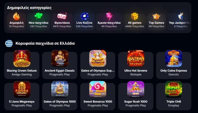 Το Yep Casino διαθέτει πλούσια συλλογή παιχνιδιών που καλύπτει κάθε κατηγορία. Αν ψάχνετε για ένα online καζίνο με μεγάλη ποικιλία, εδώ θα βρείτε επιλογές για κάθε γούστο, από κλασικά παιχνίδια μέχρι live εμπειρίες. Η πλατφόρμα συνεργάζεται με αξιόπιστους παρόχους λογισμικού, εξασφαλίζοντας υψηλή ποιότητα. Με σχεδόν 6500 διαθέσιμα παιχνίδια, το καζίνο προσφέρει επιλογές σε όλες τις δημοφιλείς κατηγορίες, ώστε κάθε παίκτης να βρει αυτό που του ταιριάζει.